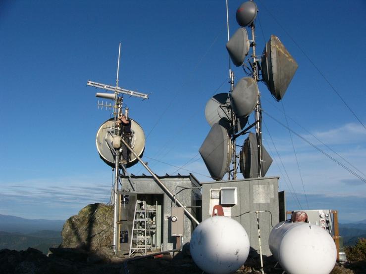 | Mt. Bradley communications site, Josh (K7GVI) is installing antennas (Left) |