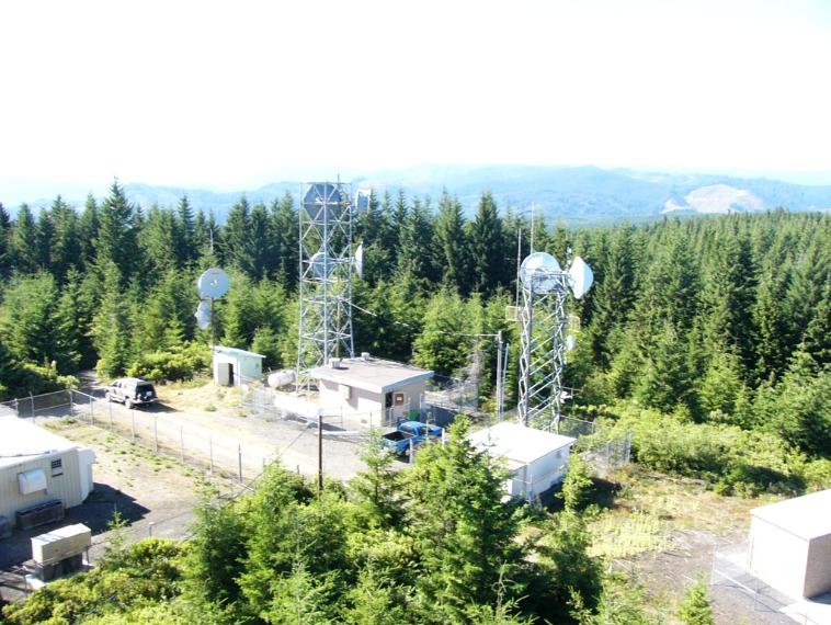 | Looking down on the site from the ODF lookout tower. Also has a 24/7 video camera on the roof for site security. Monitored by the local county Sheriff-911 center for vandels. Along with a hidden camera on the access road below. |