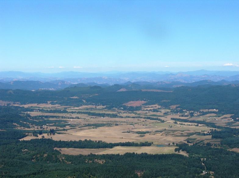 | Looking East over the Camas Valley & Roseburg, with the Cascade mountain range behind. |